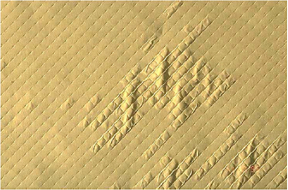 任何時刻,產(chǎn)水壓力高于進水或濃水0.3bar,復合膜就可能發(fā)生復合層間的剝離,可通過產(chǎn)水探測法來確定這類損壞。當打開受到產(chǎn)水背壓嚴重損壞的膜葉時,通常還會看到平行于產(chǎn)水管的膜最外邊出現(xiàn)拆痕,常??拷钔鈧?cè)的膜袋粘接線處。膜的破裂最有可能出現(xiàn)在進水側(cè)、最外側(cè)和濃水側(cè)這三處粘接密封線附近,其他位置受到進水網(wǎng)格的支撐,很多網(wǎng)格的小格內(nèi)就會出現(xiàn)很多氣泡狀剝離,使得膜脫鹽層受到強烈拉伸,元件的脫鹽率降低。
