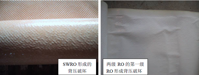 反滲透產水背壓是指反滲透產水靜態壓力大于給水或濃水靜態壓力,背壓損壞是反滲透膜元件使用中常見的故障之一,產水背壓會會導致產水從膜的產水側壓入進水側,從而導致反滲透膜進水側、最外側和濃水側這三處粘接密封線附近破裂,進水網格的小格內出現氣泡狀剝離。在反滲透膜表面上的破壞形態看起來像鼓泡,沿著進水隔網有規律地分布,鼓泡的部位其微觀結構已經破壞,孔徑變大,透鹽增加,導致反滲透系統脫鹽率下降。對膠線破壞后會導致給水側/濃水側高電導率的水漏入產水中導致反滲透系統脫鹽率下降。因此,任何時候都要避免產品水側產生背壓,產水壓力不得高于進水或濃水0.3bar。