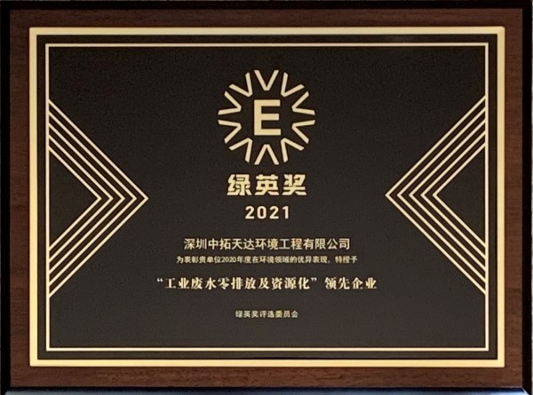大會舉辦期間,公布了2021年“綠英獎”獲獎名單,深圳中拓環(huán)境工程有限公司很榮幸地被授予“工業(yè)廢水零排放及資源化 領(lǐng)先企業(yè)”獎項。